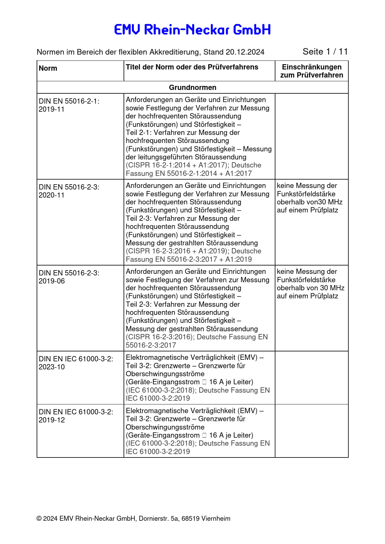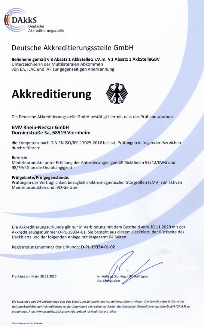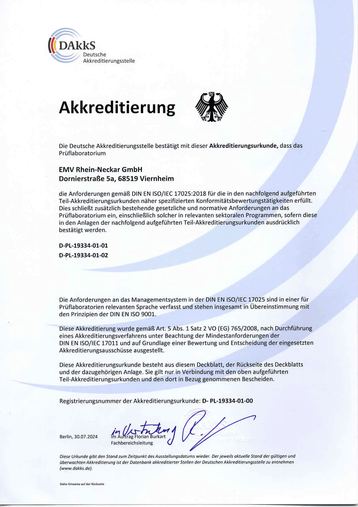 Das Labor der EMV Rhein-Neckar GmbH ist ein durch die DAkkS Deutsche Akkreditierungsstelle nach DIN EN ISO/IEC 17025:2018 akkreditiertes Prüflabor. Die Akkreditierung gilt nur für den in der Urkundenanlage D-PL-19334-01-01 aufgeführten Akkreditierungsumfang.